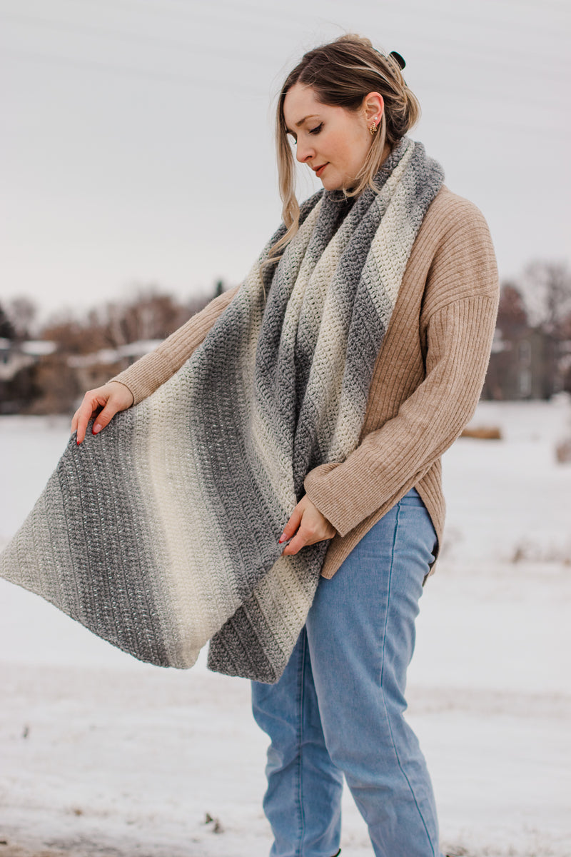 The Woodward Scarf uses a gradient yarn, Lion Brand Scarfie, to create a beautifully soft striping pattern throughout this design. Although this is a classically shaped rectangular scarf, in this pattern you will crochet on a diagonal (this is also called “on the bias”), beginning in one corner and ending in the opposite corner for a unique take on a basic scarf!