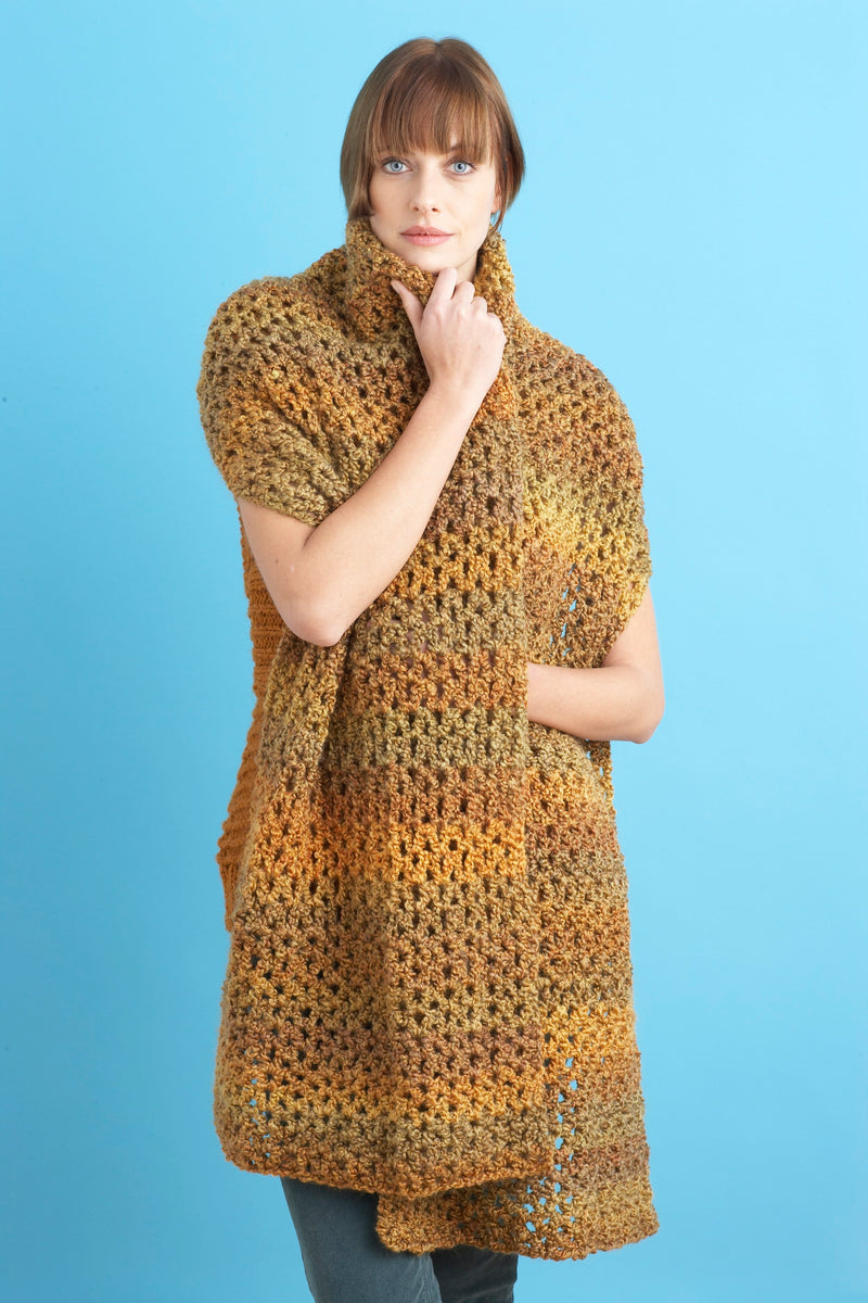 The Arrow Lake Shawl - Version 1 is a crochet shawl pattern made with bulky weight yarn that has a skill level of easy.