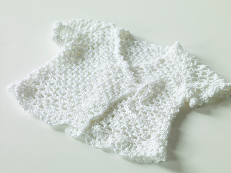 Finished Chest 24 (25, 27, 28.75) in. [61 (63.5, 68.5, 73) cm] tied closed. Finished Length 12.5 (14, 14.5, 15.75 in. [32 (35.5, 37, 40) cm] including edging.