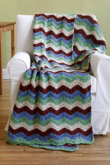 The Coastal Ripple Afghan Pattern is a crochet afghan pattern made with bulky weight yarn that has a skill level of easy.