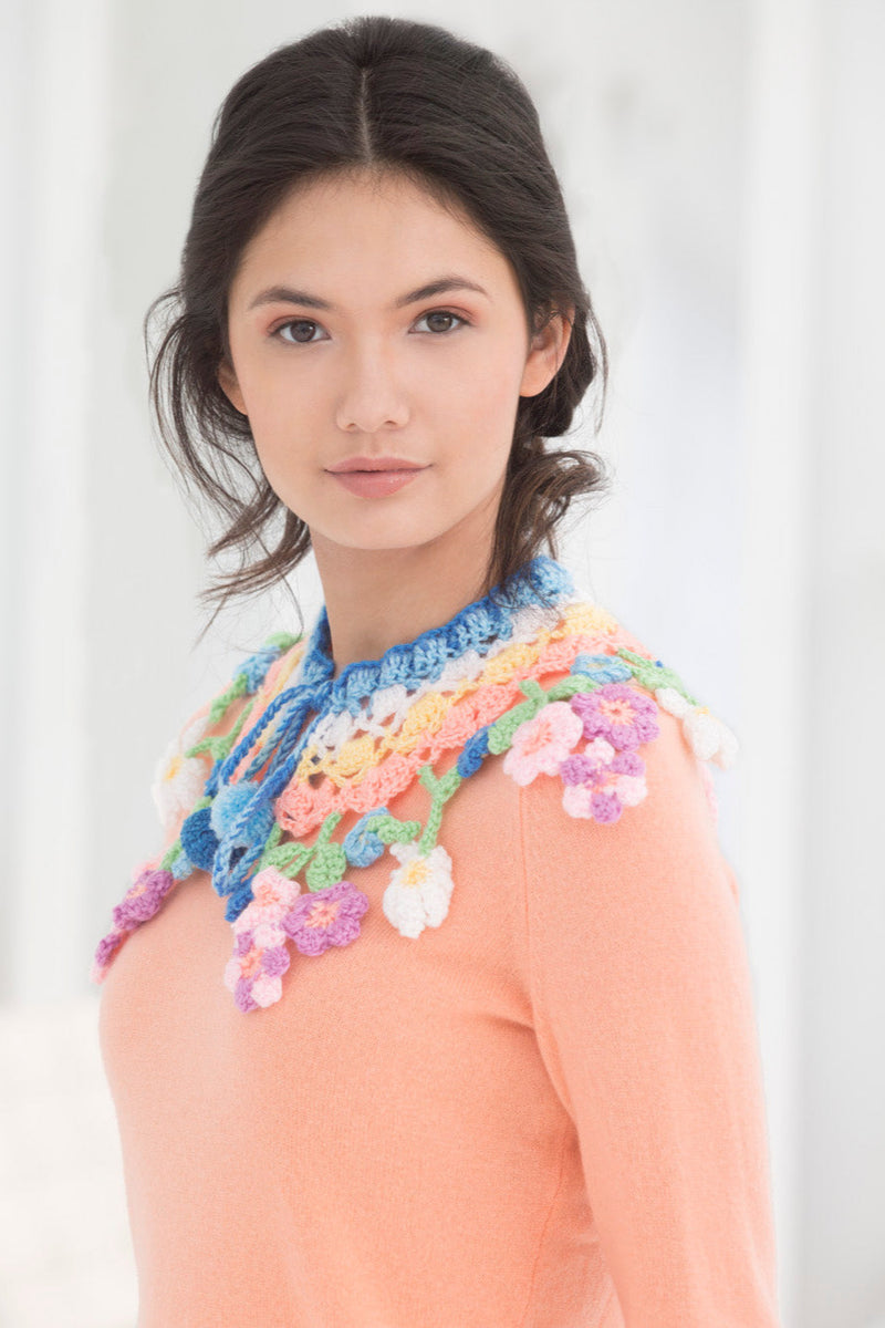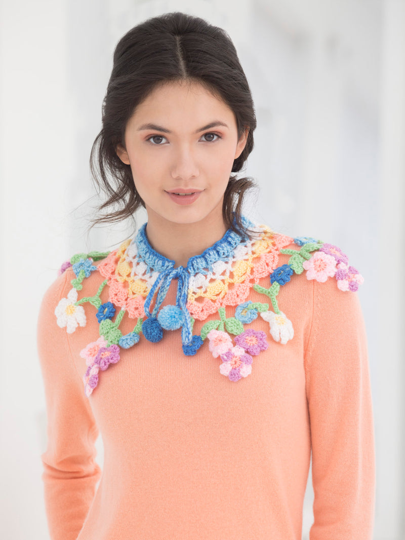 The Floral Collar is a crochet accessory pattern made with fine weight yarn that has a skill level of advanced.