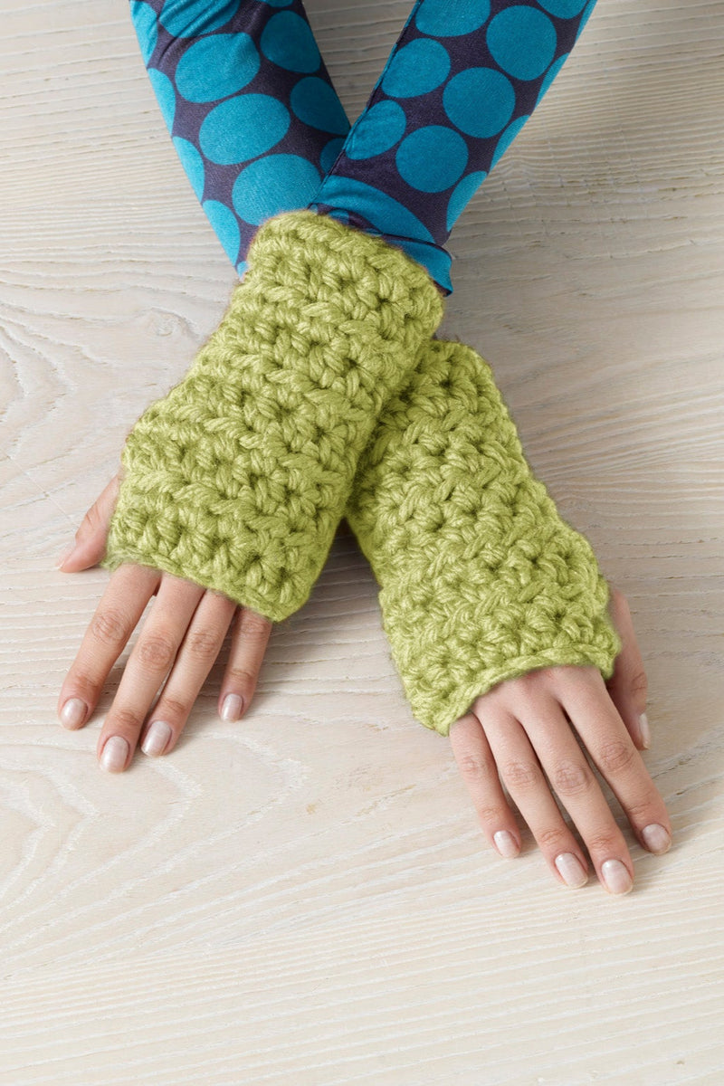 The Green Thumb Wristers is a crochet accessory pattern made with super bulky weight yarn that has a skill level of beginner.