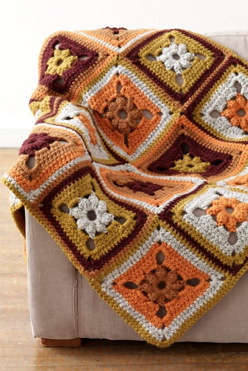The Harvest Patchwork Afghan is a crochet afghan pattern made with super bulky weight yarn that has a skill level of easy.
