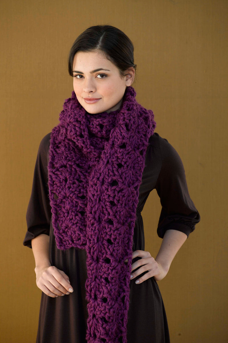 The Imogene Scarf is a crochet scarf pattern made with super bulky weight yarn that has a skill level of intermediate.