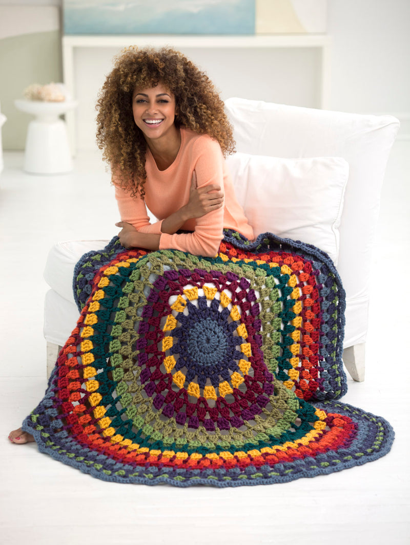 The Newfield Circle Afghan is a crochet afghan pattern made with super bulky weight yarn that has a skill level of easy.