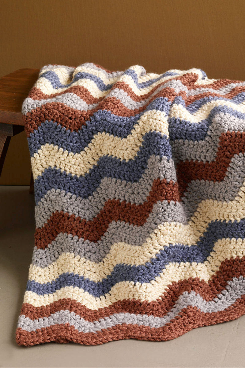 The Smoky Mountain Ripple Afghan is a crochet afghan pattern made with super bulky weight yarn that has a skill level of easy.