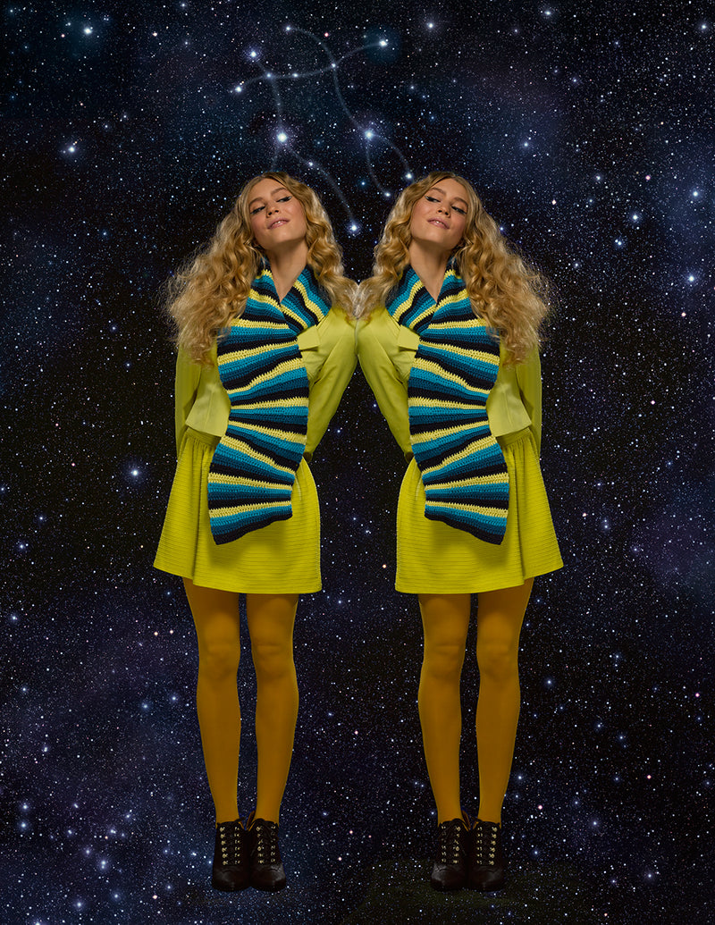About 8 1/2 x 57 in. (21.5 x 145 cm).COLOR SEQUENCE Work *2 rows with A, 2 rows with B, 2 rows with C, 2 rows with D; rep from * for Color Sequence.SCARF With A, ch 34. Row 1: Sc in 2nd ch from hook, sc in next 10 ch, hdc in next 11 ch, dc in last 11 ch