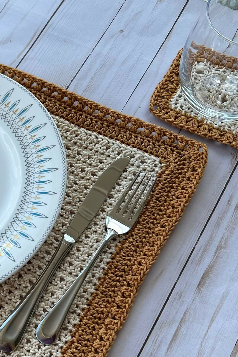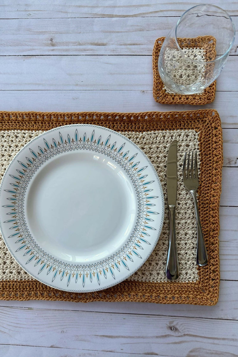 Add to your dining room essentials with this textured placemat and coaster set designed to be functional and stylish. Made with high-quality cotton yarn, this set provides durability and pleasing aesthetic. Uses a fun crossed double crochet stitch.