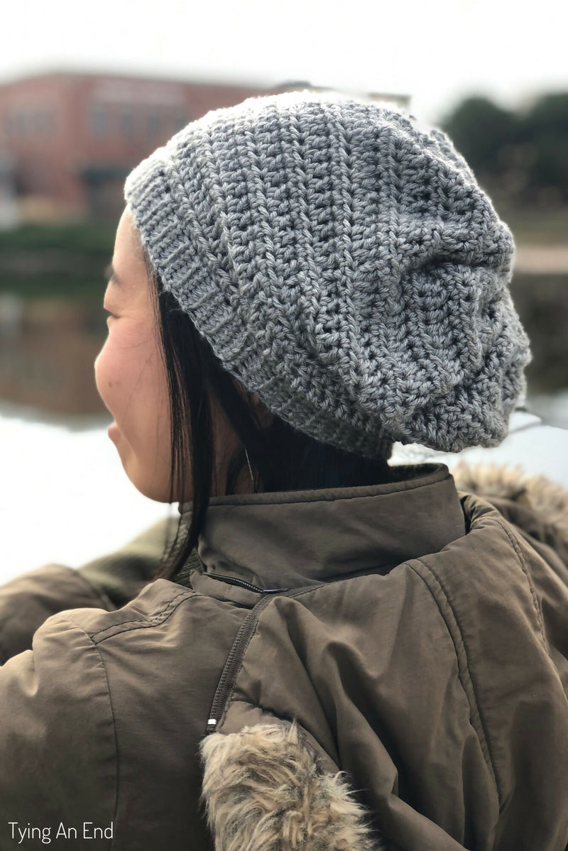 Brim: 22 rows of SL ST FLO = 4” Body: 14 stitch x 9 rows in pattern = 4″ x 4”