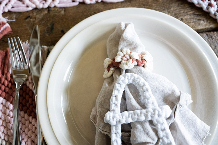 The Flower Napkin Ring is a macrame pattern made with super bulky weight yarn that has a skill level of beginner.