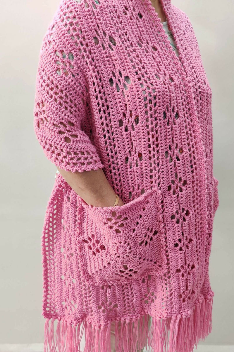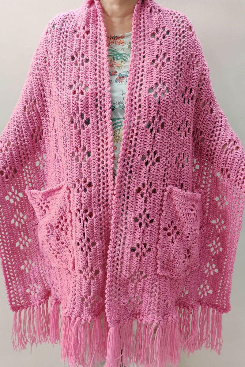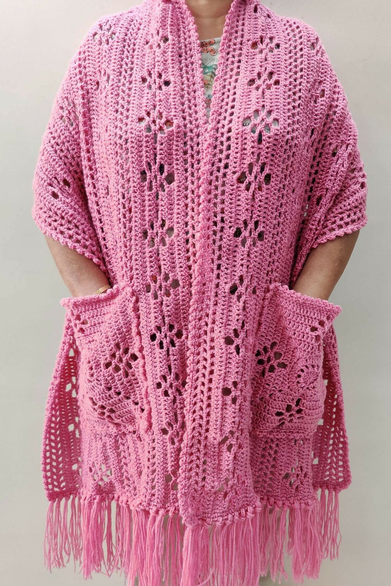 Both decorative and cozy, this shawl perfectly balances style and comfort — ideal for layering over any outfit. Don’t forget the cozy pockets with a matching motif—they’re perfect for keeping your hands warm on chilly days, so no gloves needed!