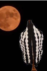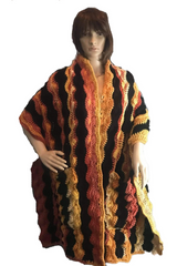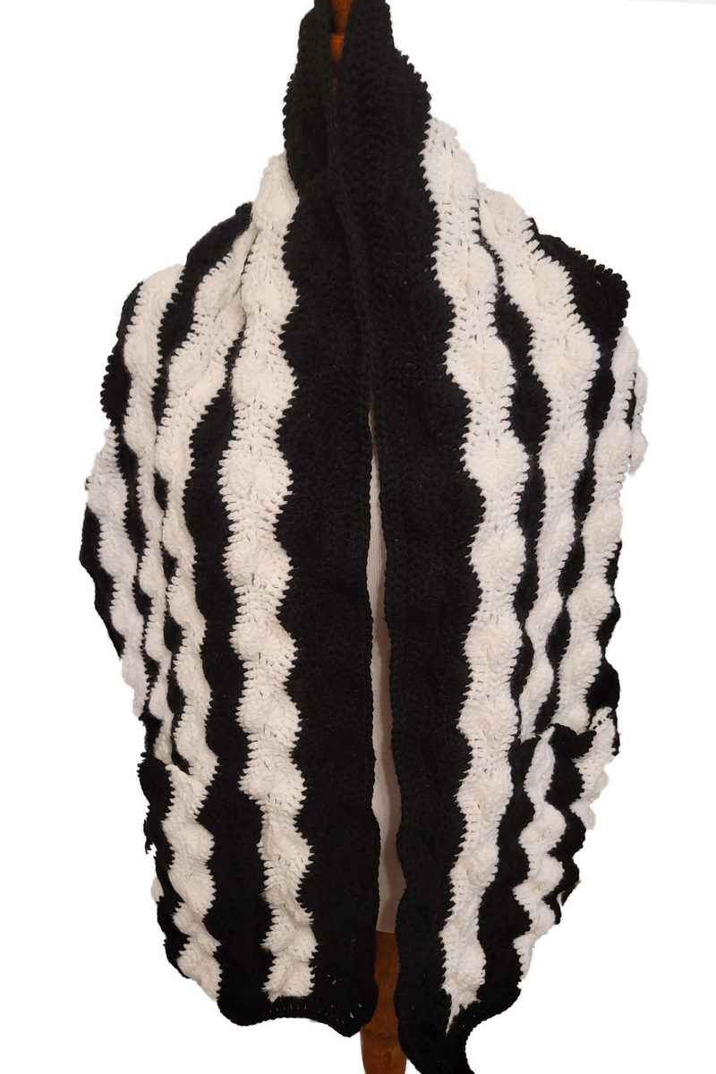 Dreamy pocket shawl crochet pattern with waves of light and dark designed to look like the full moon. This would be a perfect accessory for Halloween. The pattern uses worsted weight yarn and a modified version of the Catherine's Wheel stitch to make circles. Make it in dark versus light stripes for the full effect. YouTube tutorial available for Catherine's Wheel motif.