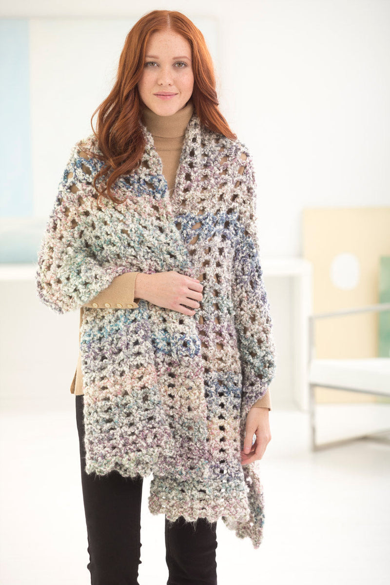 The Gentle V-Stitch Shawl is a crochet shawl pattern made with super bulky weight yarn that has a skill level of easy.