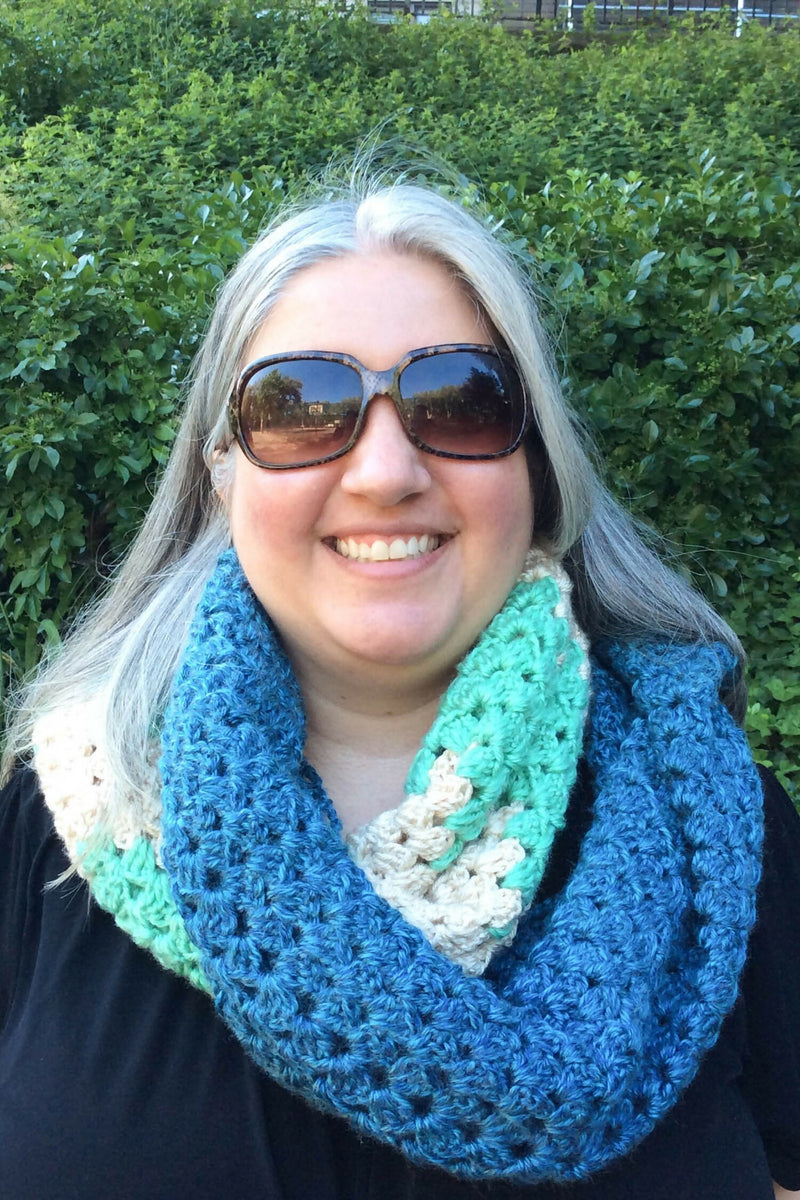 This rippled, rectangular granny stitch shawl is long enough to wrap yourself in comfort. It can be worn as a shawl or wide scarf. The combination of stripes and color blocking make a dramatic statement piece. The simple, one row repeat pattern makes this a perfect prayer shawl or mindful crochet project.