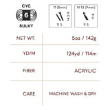 Heartland® Thick & Quick® brings the warmth and softness of the classic Heartland® yarn into a super bulky weight. With rich heathered shades and 124 yards per skein, this 100% acrylic yarn is perfect for quick-to-crochet and knit scarves, cozy hats, and oversized sweaters. Its smooth, lofty texture makes for beautifully defined stitches, and its machine-washable nature ensures hassle-free care.