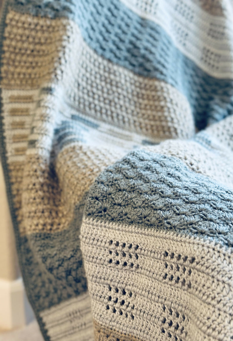 A little about the pattern: The pattern is written is US Terminology with instructional photos and a color chart for one of the panels included. All eleven panels build from the bottom up with no sewing or assembly required. Three different colors are used although it can be done in one color with a monochromatic theme. A 5mm hook is used with the yarn indicated.