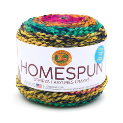 Homespun® has been a beloved Lion Brand yarn for over twenty years. Now, Lion Brand® is introducing the same classic yarn in a new easy-to-use cake put up in twelve mouth watering self-striping shades. This new put-up was created to prevent tangles as you work with the generous 185 yards in the same 6 oz crafters already know and love. And with the smaller size of the cake, there will be more room on your yarn shelves to stash every color.