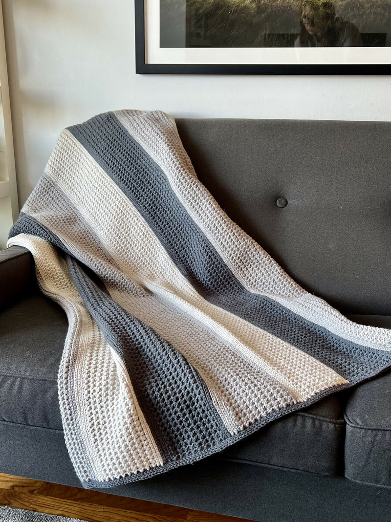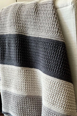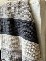 A cozy, modern striped blanket that makes a beautiful accessory for your sofa or bed or lounge chair or favorite reading nook. Its dense design provides warmth and is also reversible. The blanket is crocheted in one piece with a border – no sewing required. Although the yarn in this pattern is in alternating three neutral tones, you can customize your color choice to suit your home décor or go monochromatic and make it all one color. The HUDSON Blanket is sure to be a wonderful addition to your home.