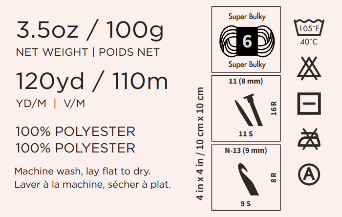 It’s So Fluffy! And super soft, too! Whip up unique accessories and crafts with this funky textured yarn. It’s machine washable (100% polyester) and comes in a sophisticated palette of colors, which makes it a great choice for creating cowls, scarves, hats, and home décor, too. Each cake provides 120 yards of super bulky weight yarn.Yarn Weight