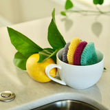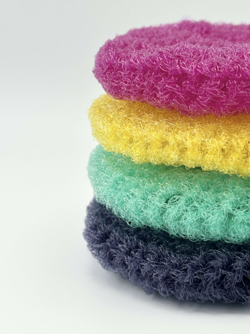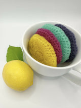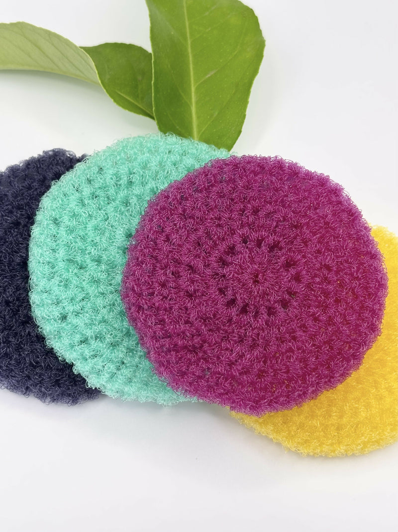 Kitchen Scrubby Crochet Pattern PDF Download. This pattern is written in English with US Terminology, not the actual product. Made from Lion Brand Stitch Soak Scrub nylon yarn, this is the best scourer scrubby (scrubbies) that you will find. Gentle yet effective, it is the perfect size to hold. Beginner/intermediate level crochet, although beginners can follow the instructions easily. The pattern uses one continuous thread, not multiple pieces and the yarn comes in multiple colors. Featured colors are Blue Indigo, Cyber Yellow, Pansy, Cabbage and Eventide. Finished size is 3 1/2" when using a J/6 mm hook and the recommended yarn.