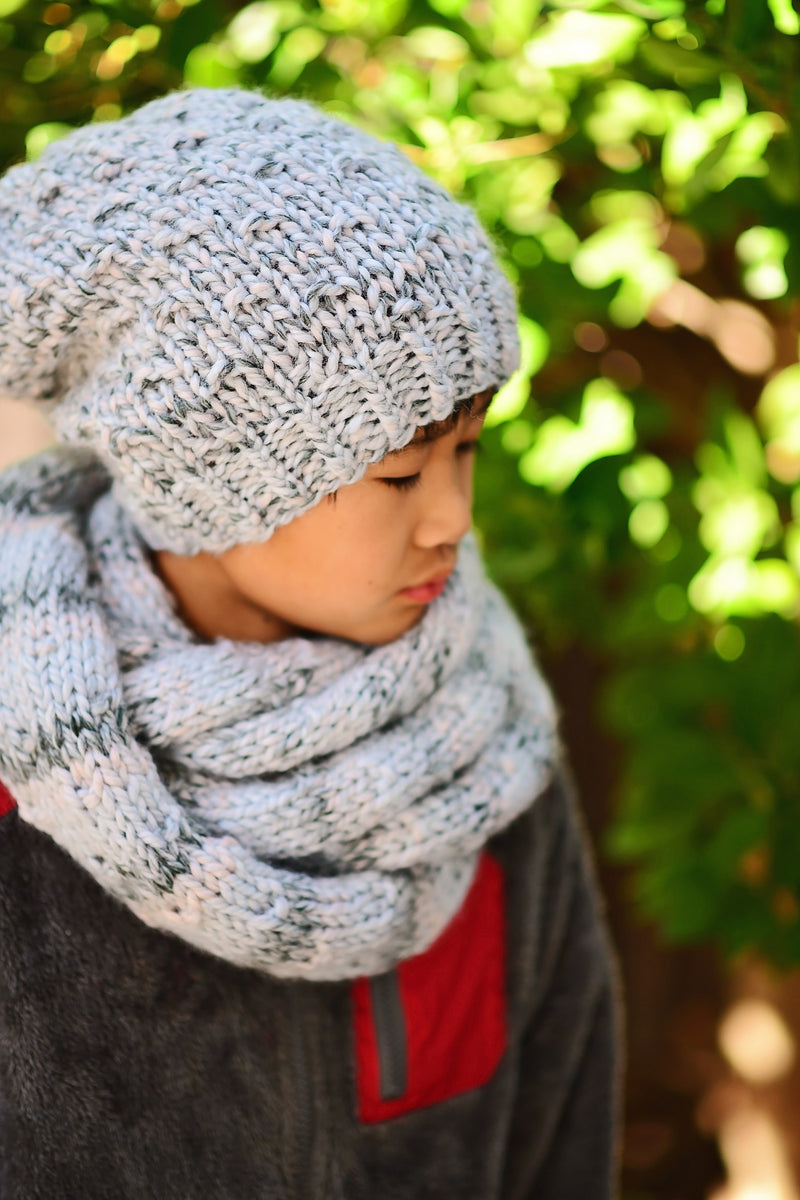 The Arctic Slouch Beanie & Infinity Scarf uses simple stiches to create a subtle texture. It knits up quickly using super bulky yarn. It’s the perfect beanie & scarf combo for a little extra coziness during the cold months and is great for the whole family!