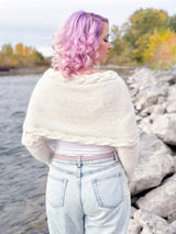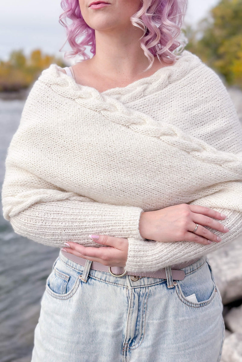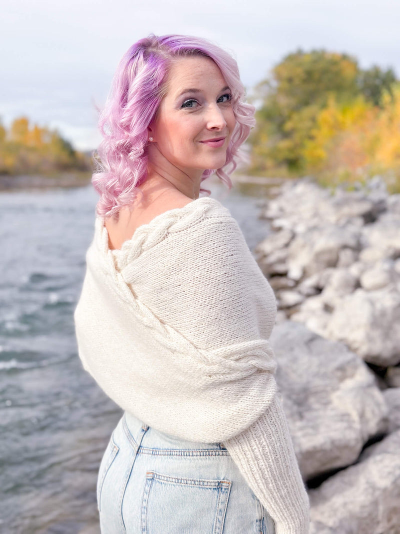 A scarf that doubles as a wrap? That triples as a sweater? Yup. Count me in. The newest addition to my sweater scarf design collection is a worsted weight, cozy scarf with sleeves made with a blown alpaca yarn that gives the most beautiful soft halo and drape. It can be worn multiple ways: as a regular scarf, with the cross in the front, or with the cross in the back. Each gives it a delicate and ethereal look and feel. Pair it with a tee and some ripped jeans for a more laid-back vibe or drape it around your shoulders on top of a little black dress (or your wedding dress!) for date night; this piece is perfect for all occasions.