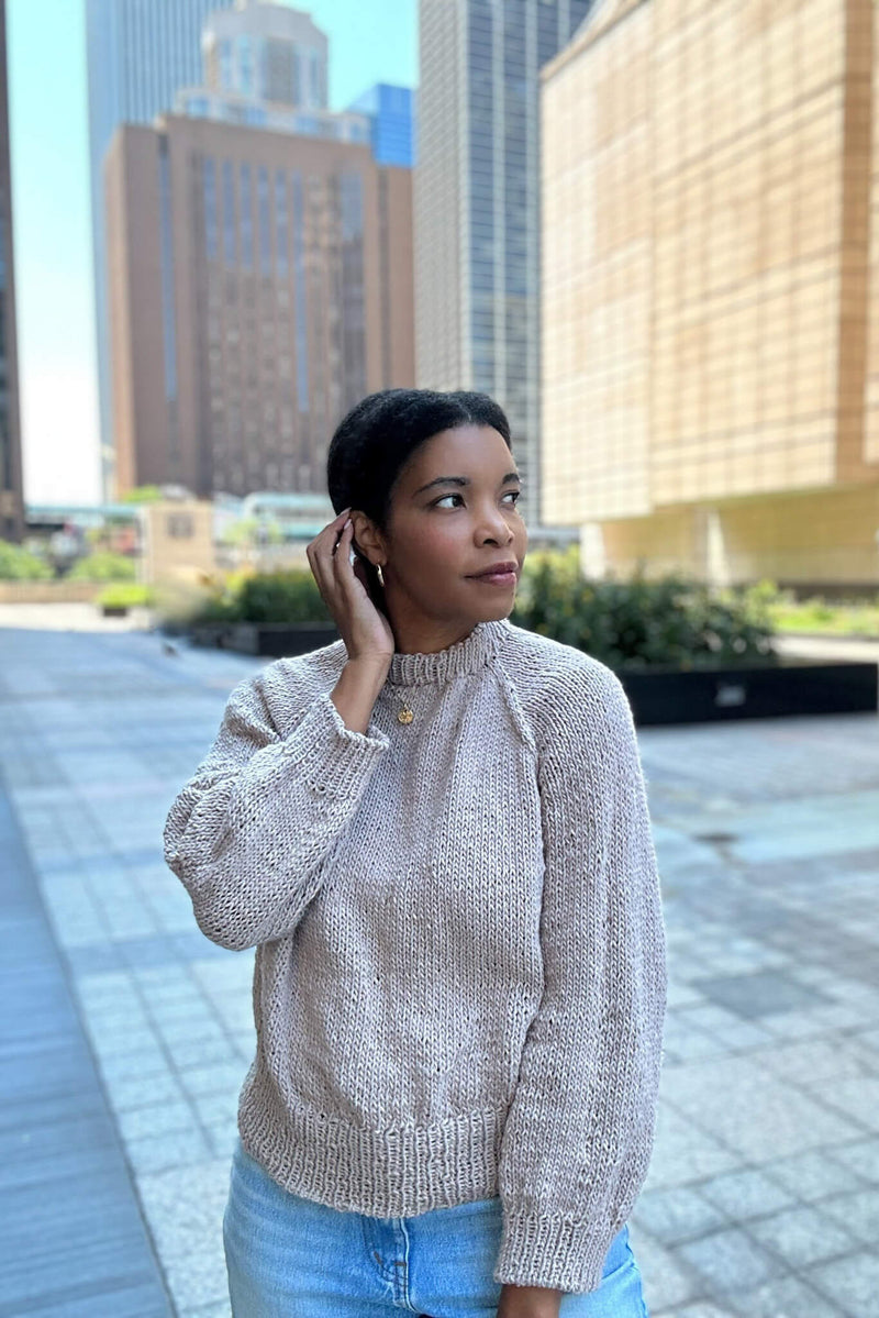 The Citydream Sweater is a crewneck raglan essential for the minimalist knitter on the-go, and an ode to a popular book series quote “to the stars who listen & the dreams that are answered.” I knit this in Color Theory, an easy-care acrylic worsted weight yarn for wearable seasonal pieces. Knit seamlessly in the round with a folded on-trend neckband, ribbed hem and sleeve edging amid a stockinette body and long sleeves, this garment embraces easeful knitting with approachable yoke shaping and finishing that creates the perfect seasonal sweater for days spent reading, dreaming, and trips around the city.
