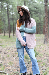 Gorgeous colors and soft yarn come together to make this eye catching, squishy cardigan for year round wear! This sweater is knit flat and it uses the simple garter and seed stitches. It’s a great option for newer knitters and experienced knitters alike. With it’s variety of texture and generous length on the sleeves, you’re sure to be comfy as can be. Choose your favorite three colors and hop to it!