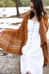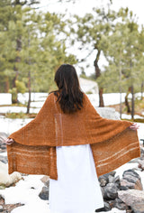 Soft, light, and full of interest, this textured wrap is a beautiful accessory for your spring and summer wardrobe. It’s generous size makes it a show stopper, and while it looks like a complicated knit, the entire wrap uses simple stitches. Take a journey through textures that will keep you interested while making a super comfortable, beautiful wrap. Whether you like large or smaller shawls, you’ll appreciate that it’s easy to customize to any size.