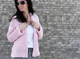 The look and feel of this superbly soft, airy cardigan will remind you of cotton candy! It features a comfortable, loose knit fabric with simple stockinette and garter stitches. The stitch definition is gorgeous and it works up quickly with large knitting needles. Because it’s made with minimal shaping and only requires beginner knitting skills, this is the perfect project for first-time sweater makers.