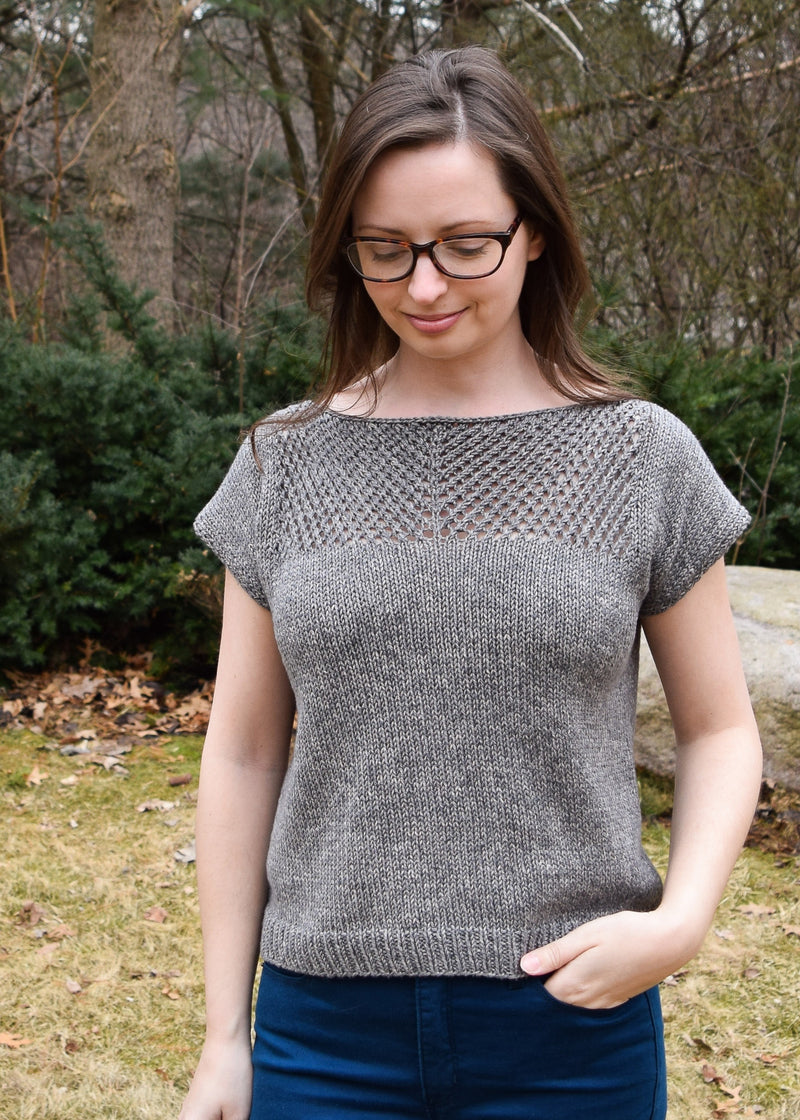 The Daybreak Tee utilizes 1-3 inches of positive ease for a classic and flattering fit. It is knit simply in the round from the bottom up, then the front and back are separated and worked flat. The sleeves are created by casting on a few extra stitches. The shoulders are finished with a 3 needle bind off, and minimal seaming is required for under the arms.