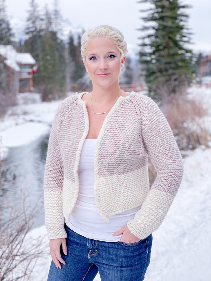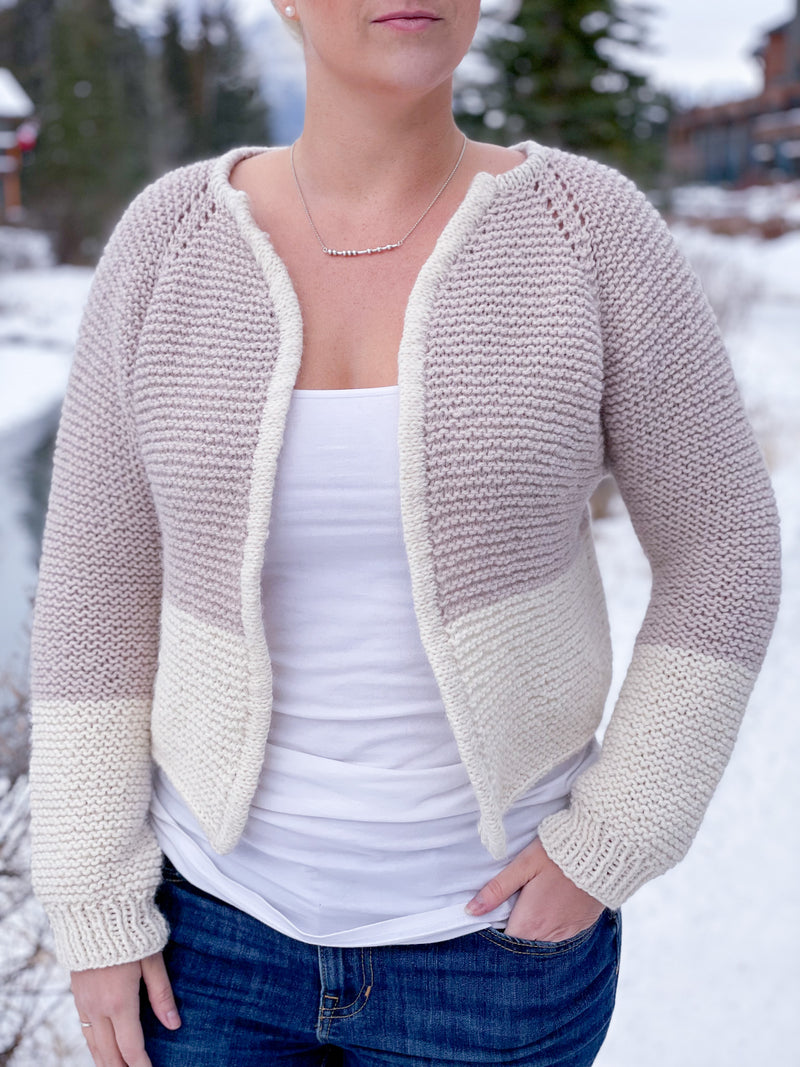 If you were looking for a classic and timeless piece, I’m glad you’ve found it. The Double Dipped Cardi is a top-down garter stitch cardigan that has the most darling details. With colour blocking on both the body and arms, it sports double brim collars on both the top and the sides and features raglan eyelets that really sets it apart. With 0-1.5" of negative ease built in (when “closed”), this cardi is slightly cropped in the back, while longer in the front (due to the collar detailing). Throw it on before you leave the house, or wear it at home—either way this knit is sure to be one you keep grabbing from your closet.