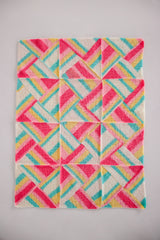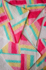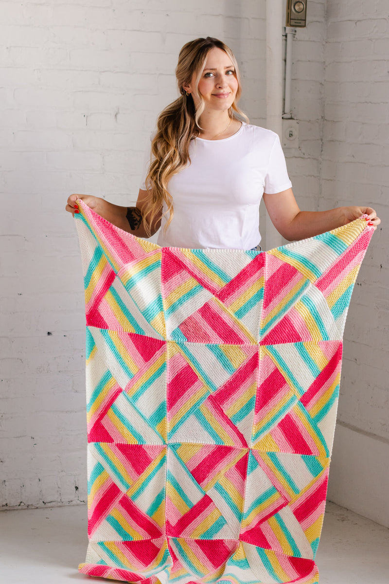 The knit stitch is the star of the show in this playful garter stitch blanket. The Dreamhouse Blanket uses the natural color changes of self-striping yarn to create a one-of-a-kind throw. Four triangles make up each square, and 12 identical squares come together to create this beautifully artsy blanket.