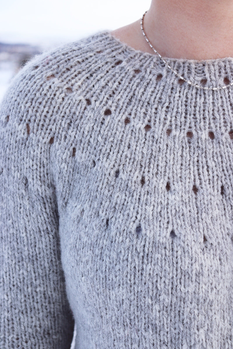 Seamless and the cutest sunburst detail of eyelet stitches, the Easy Eyelet Yoke Sweater is the perfect project for a knitter wanting to dive into their first seamless top down yoke sweater. Made with 1-3” of positive ease in mind, this sweater was designed for everyday wear.