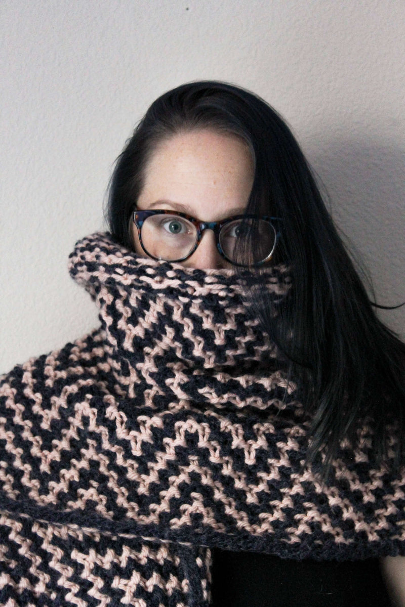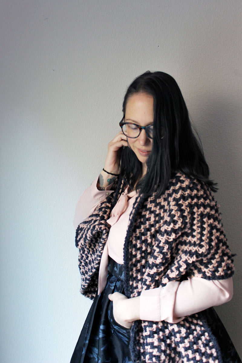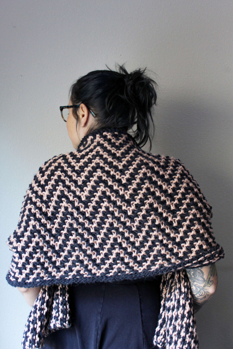 The Erotylus Shawl is a wonderfully squishy, cozy shawl. The colorwork is created with mosaic knitting, so only one color is used at a time and the design is created with slipped stitches. The fabric created is warm and thick, with an excellent “squish factor.” This shawl is perfect for everything from lounging on the couch with a book and tea, to a night on the town paired with your fanciest dress.