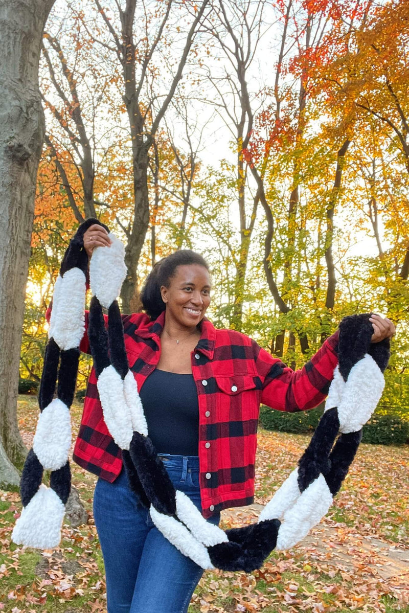The Faux Paper Chain Scarf puts a twist on the classic paper chain holiday craft! Wrap yourself in a cloud of coziness with Go For Faux yarn. Designed to be a stress-free knitting experience, this winter accessory is perfect for chilly days. Take your winter wardrobe to the next level with this eye-catching design. Whether you are keeping it for yourself or gifting it to a loved one, the Faux Paper Chain Scarf is ready to add joy to your needles this season. The sample is shown in Baked Alaska & Black Panther, however don’t be afraid to change up the colors to fit your style!