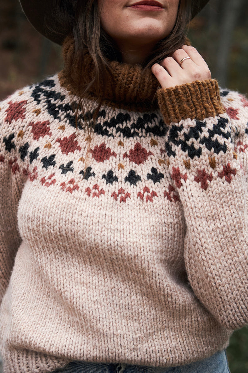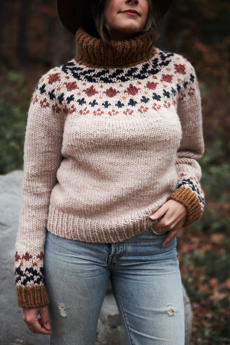 This traditional yoke sweater takes on a playful mood with dramatic pops of color and an oversized turtleneck. The relaxed fit is quickly achieved with bulky weight yarn and is so comfortable you’ll want to wear it all season long! Perfect for frolicking through the forest or cozying up to your favorite book.