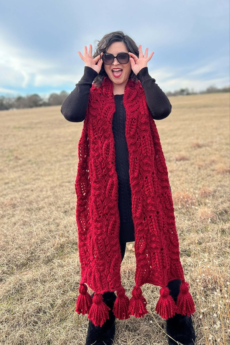 This frost flowers knit scarf is a nice way to gift oneself flowers in yarn form that will never die. Its texture is created through a 24-row repeat and constructed to be a long rectangle. Its shape allows it to be a chunky statement piece that can be wrapped multiple times or draped around the neck to let the design speak for itself.