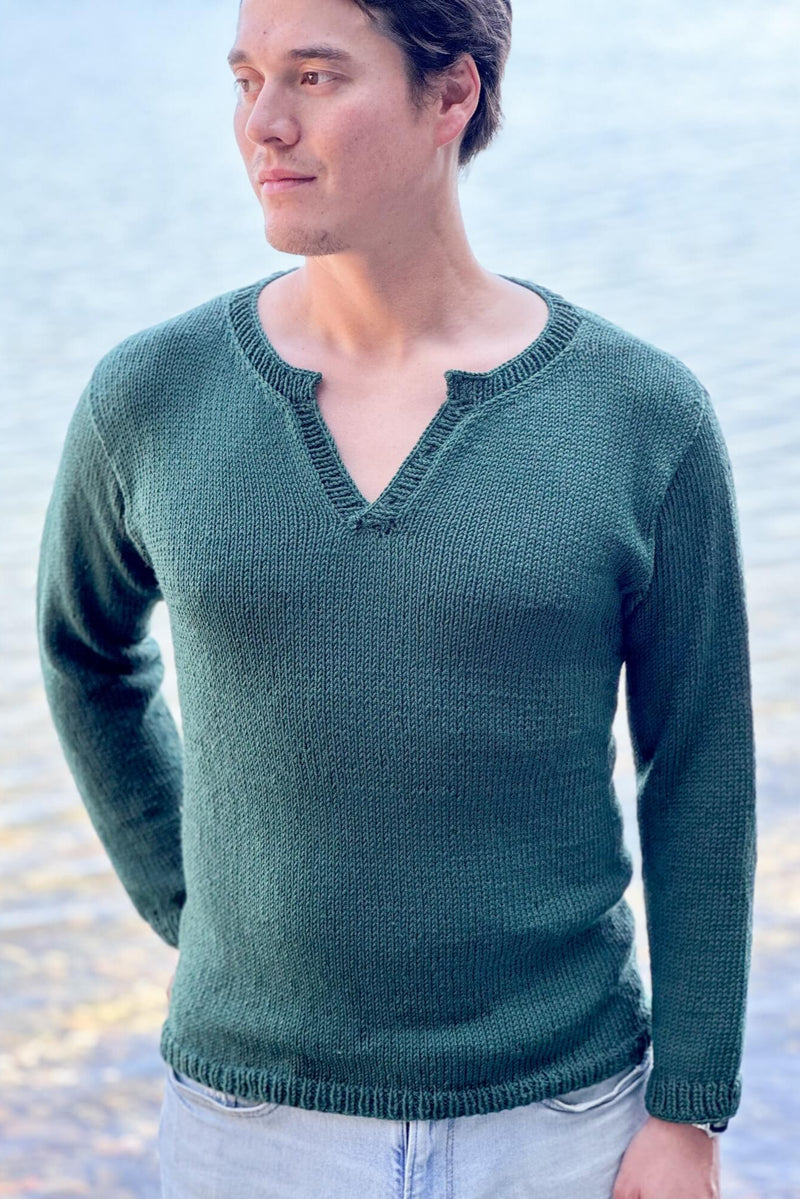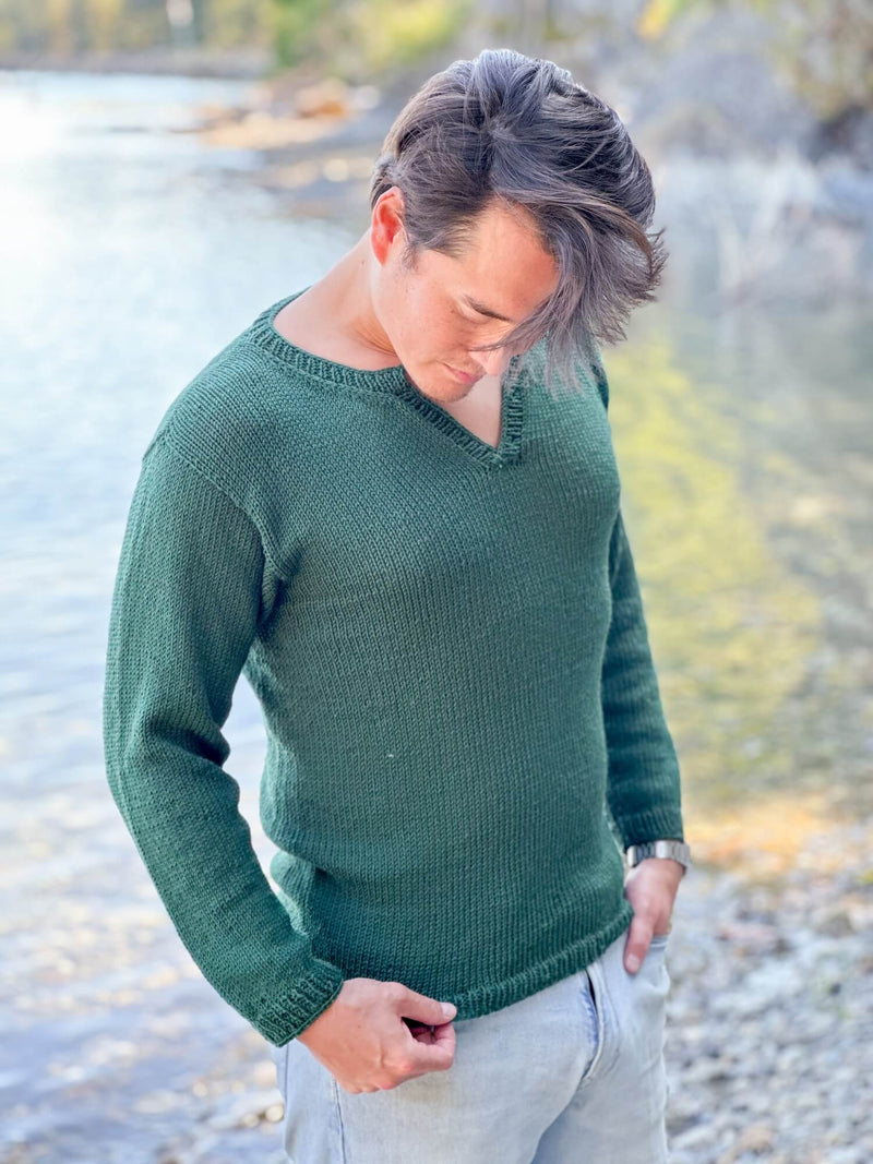 Knit in the round, this seamless sweater is knit in a bottom-up style and has 0-2 inches of negative ease. You will cast on for the bottom hem, work up to the under arms and then split for the front and back panels. The collar is then split and then shaped in the front. Once finished, you will work the back panel and finish with a seamless three needle bind-off. The collar is then picked up in 3 sections and worked in a rib stitch. Finally, the arms are picked up and worked in the round down to the cuff.