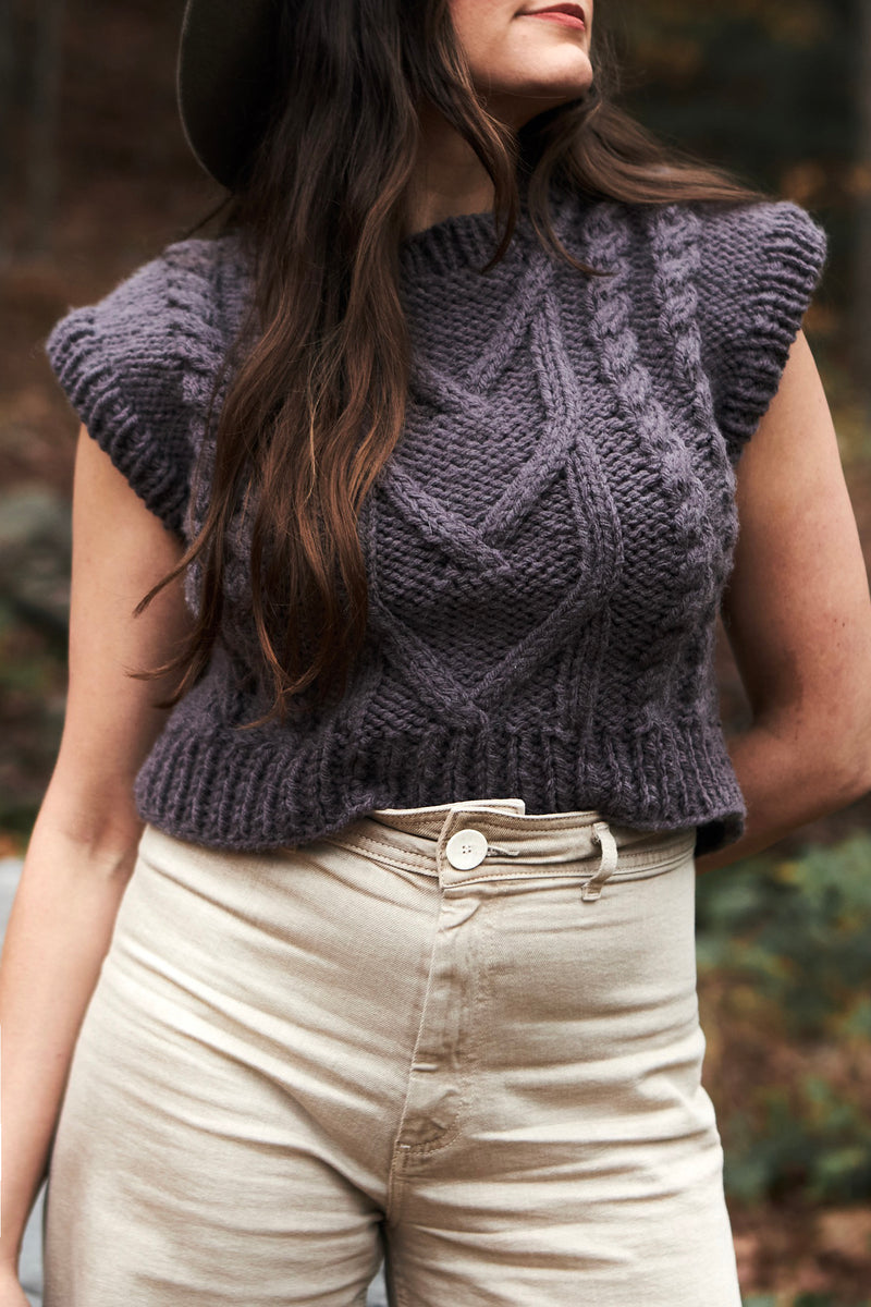 Channel your inner Annie Hall with this classic-made-modern cropped vest. Traditional cables are paired with exaggerated shoulders to freshen up a classic silhouette that’s the perfect topper for a button down or dress.