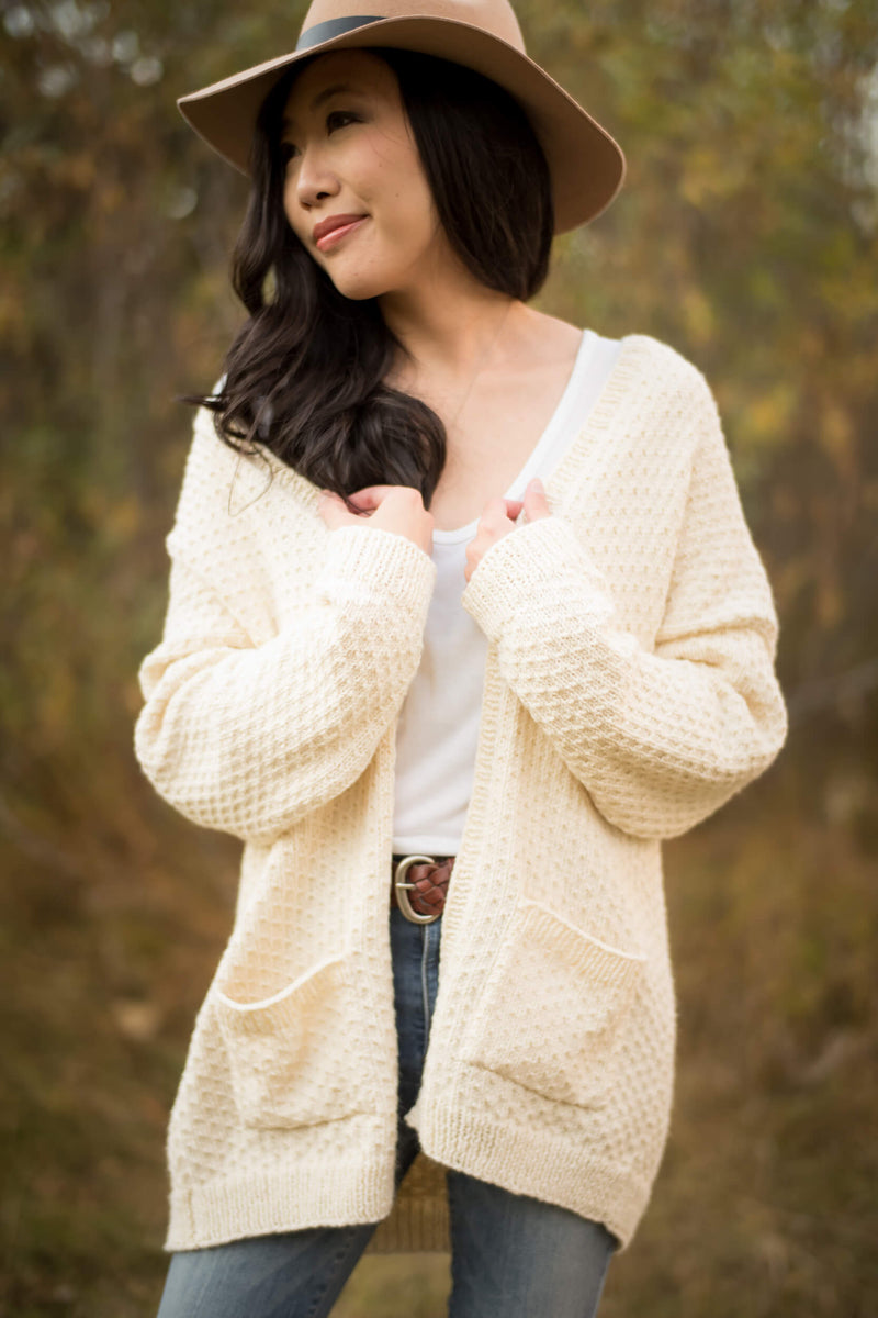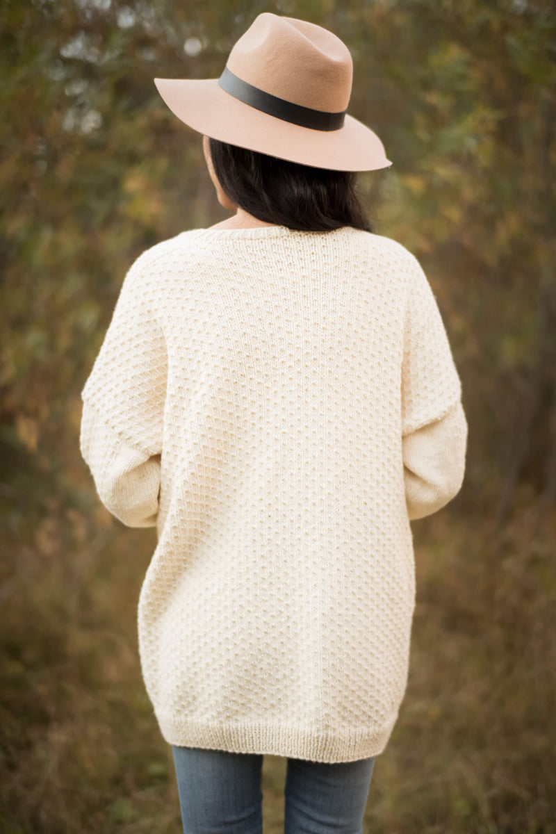 Sizing note: This drop sleeve cardigan is oversized, relaxed, loose, and slouchy with 12-18” of positive ease built into the design. This means that if the actual bust of your body is 32″ (typically a size small), the bust of the size small sweater is 12 - 18″ larger (50″).Pattern Yarn Weight