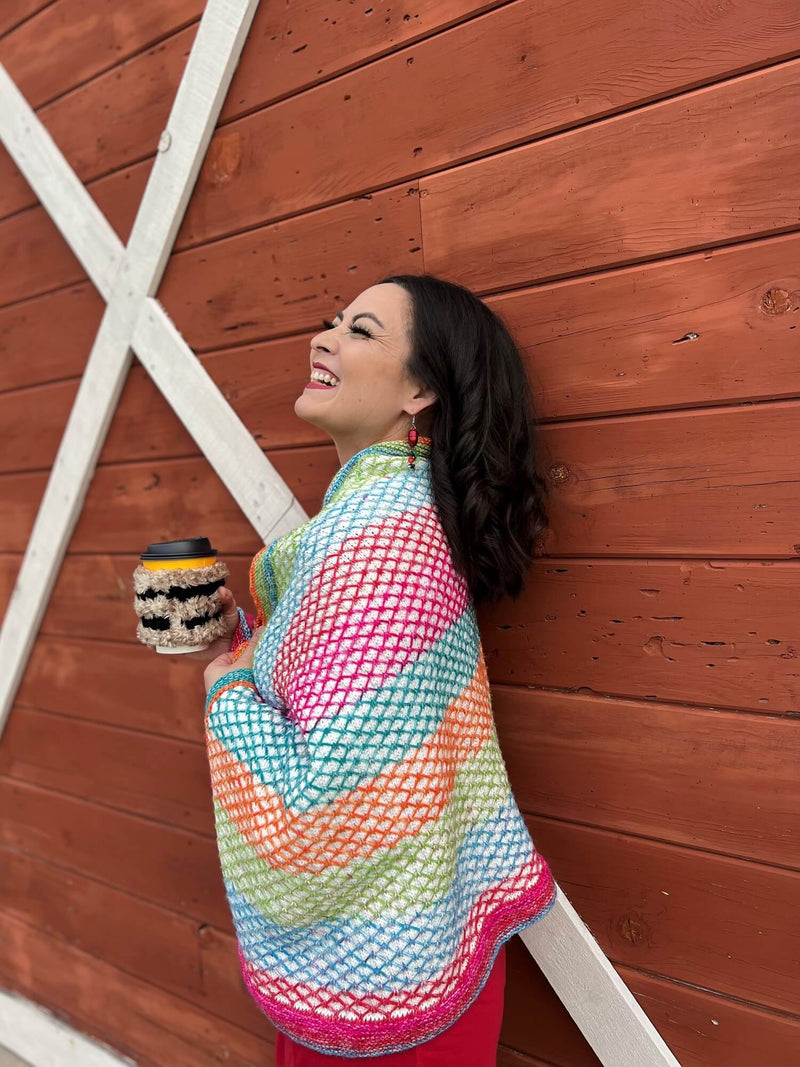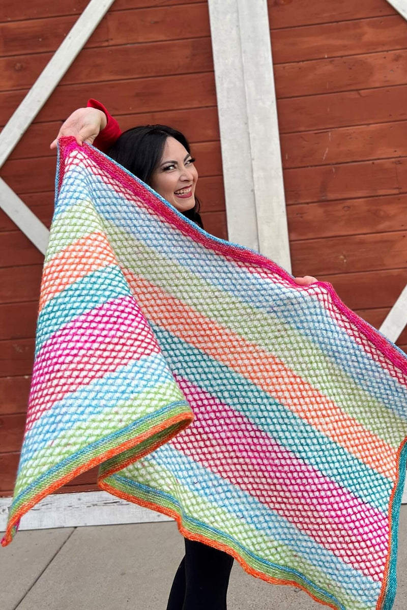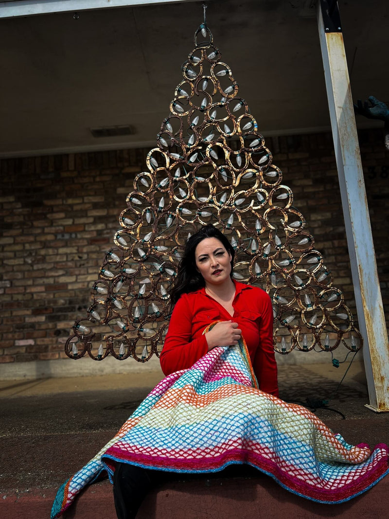 The Light Show Wrap is a colorfully bright perspective on the holiday season. Inspired by net lights, it is intended to be worn as a lap blanket or shoulder wrap while enjoying drive-thru holiday light shows followed by a mug of hot chocolate. The knitting process is also fun as it uses basic knit stitches with color changing yarn that allow the floats to create the design.