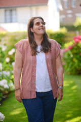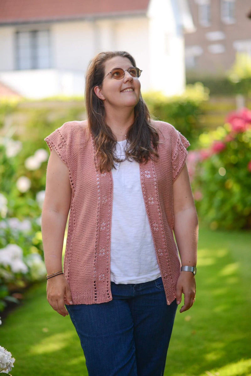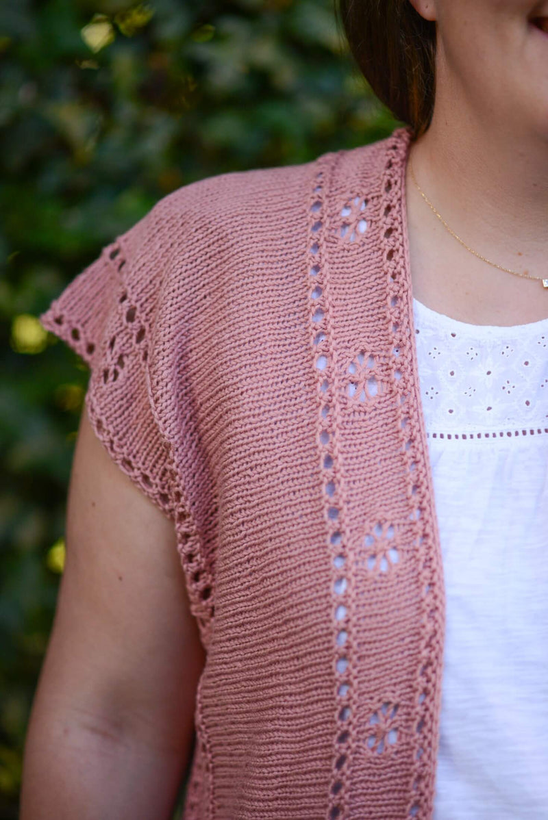 Crafted with a delicate yet easy flower lace detail, this sleeveless cardigan is ideal for those looking to try out lace knitting for the first time. The cardigan is simply constructed by knitting two long rectangles and sewing them together, making it a straightforward project for beginners and experienced knitters alike.