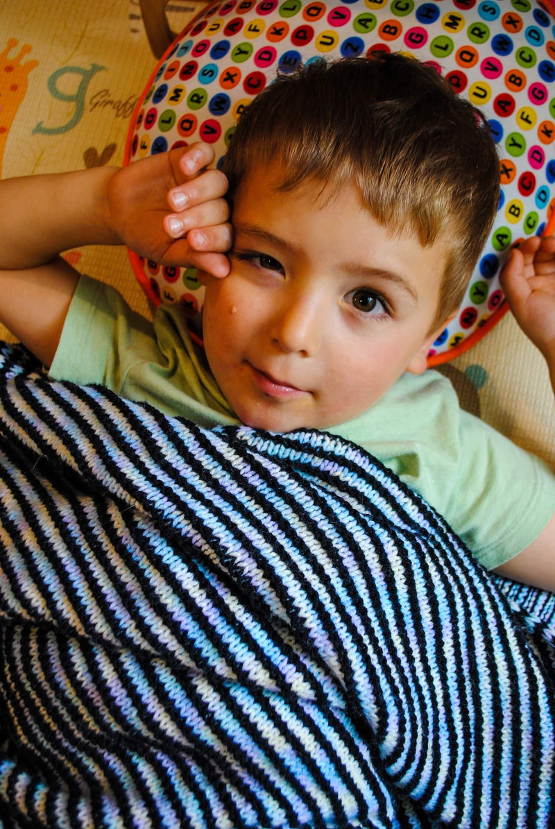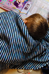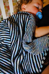 to corner, to achieve it’s square shape. The blanket features a beautiful textured stripe pattern on the right side and allows for a softer, variegated yarn to play behind dark contrasting stripes.