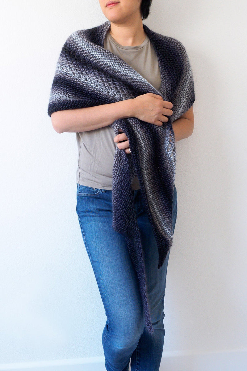 The New Paths Shawl is a slim asymmetrical shawl with a single band of eyelet lace to celebrate all the different new paths we take in life. A simple garter stitch makes up the bulk of this shawl, making it a great project for beginner knitters and those who like projects that work up quickly!