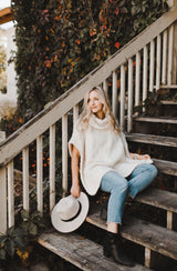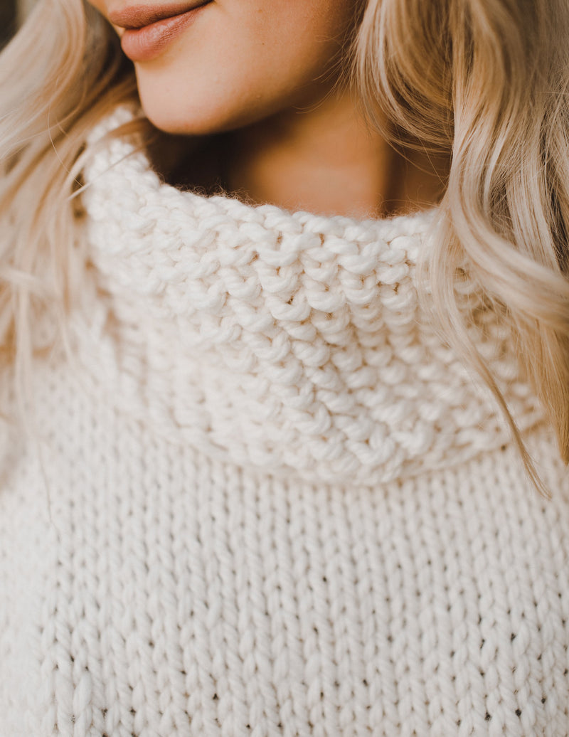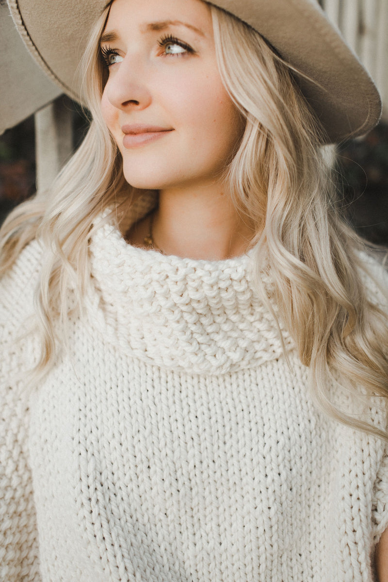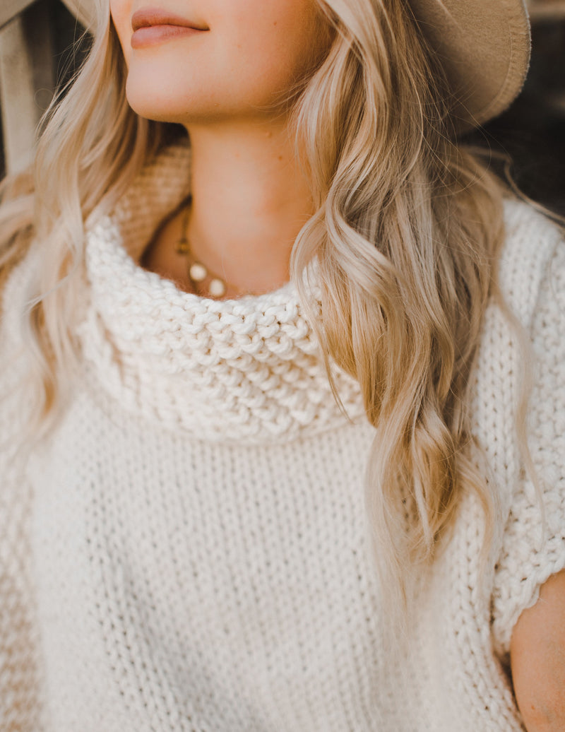 The Paradigm Poncho is a trendy layering piece with a cowl neck, perfect for transitional weather in the spring and the fall. The body is worked in stockinette with a seed stitch border. It is knit flat in one piece, and the cowl neck is worked last by picking up stitches around the neckline and working in the round in seed stitch to match the border detail.