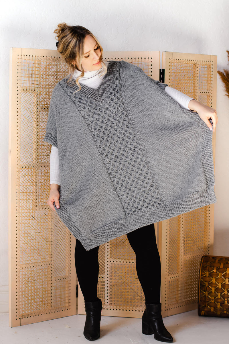Say hello to the Quail Ridge Poncho, your new favorite transitional layering piece featuring a clean, mitred V-neck and a wide center panel of squishy honeycomb cables running lengthwise down the front and back panels. In this pattern, you’ll explore cables, ribbing, stockinette, and garter stitch, keeping you engaged the whole way through. Plus, it is knit all in one piece, meaning there is no seaming involved!