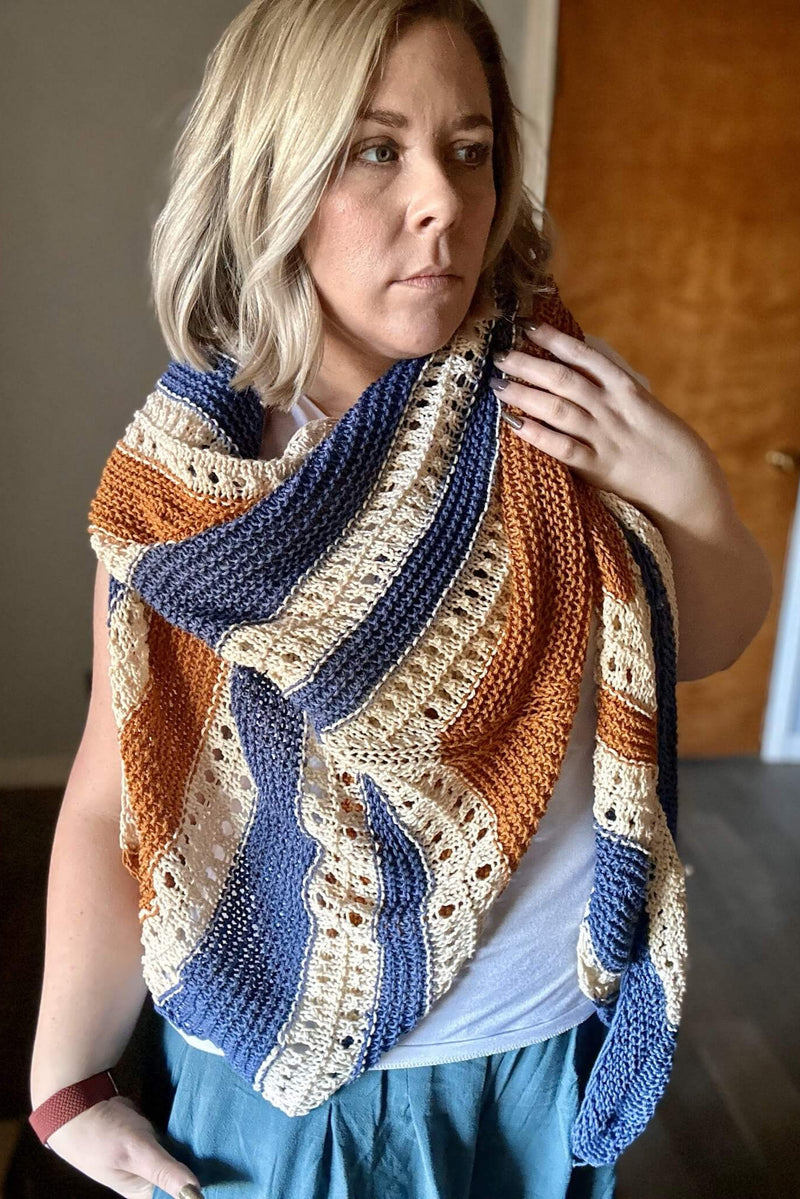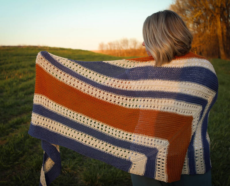 Level up your knitting with this spring ready cotton shawl! Interesting construction creates a trendy kite shape, while alternating colors and textures keep you wanting to knit just "one more row". Measuring at 106" wide, you'll love enveloping yourself in the Rising Kite Shawl.