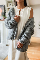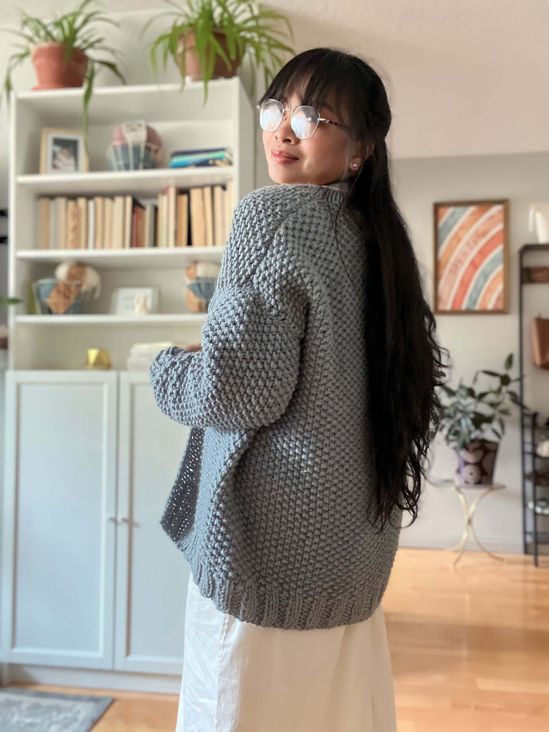 This cardigan features a simple knit/purl stitch, ribbing on the bottom and cuffs, with a stockinette stitch border around the front opening. The cardigan is made using an easy construction and just three separate pieces for minimal seaming. Rated intermediate due to stitches, minimal shaping, and some techniques used.