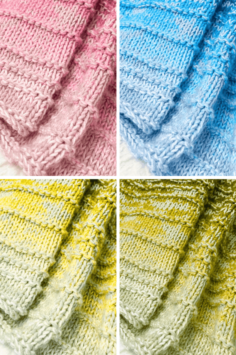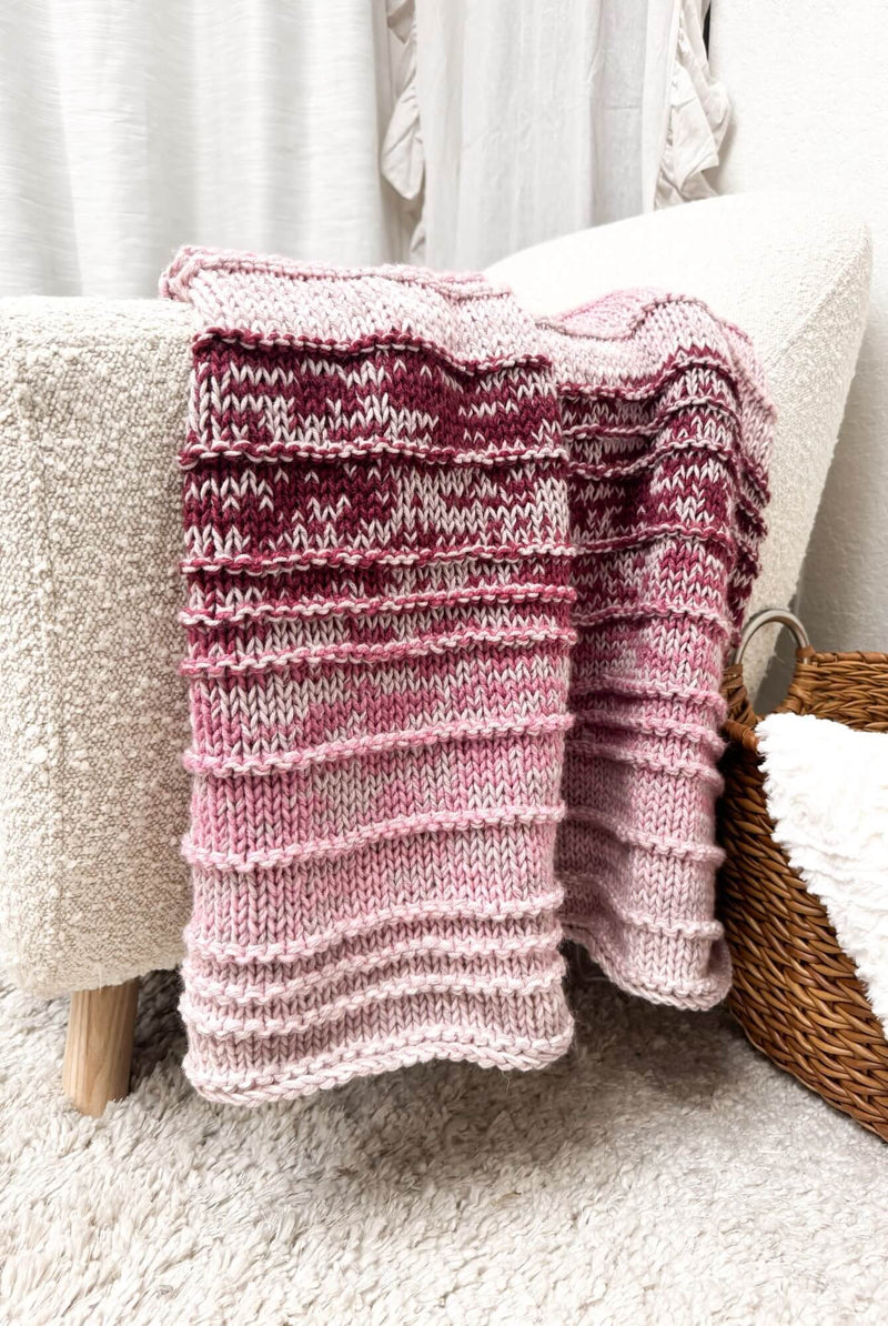 A stunning cascade of color that flows effortlessly from one stripe to the next with a self striping yarn and neutral of your choice. This features simple knit stitches and eye-catching textured repeats. The rich texture and natural color shifts make it a perfect accent for any room — inviting warmth, style, and a touch of handmade charm.